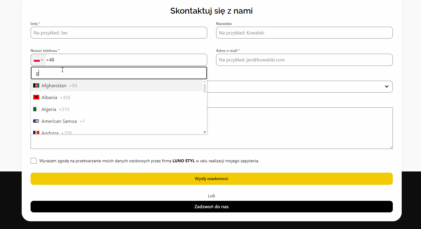 Strona Lunostyl wyposażona jest w nowoczesny formularz kontaktowy, który umożliwia szybki i łatwy kontakt z przedstawicielami firmy. Formularz został zaprojektowany z myślą o użytkownikach, zapewniając intuicyjny interfejs i minimalizując ilość wymaganych kroków do wysłania zapytania.
