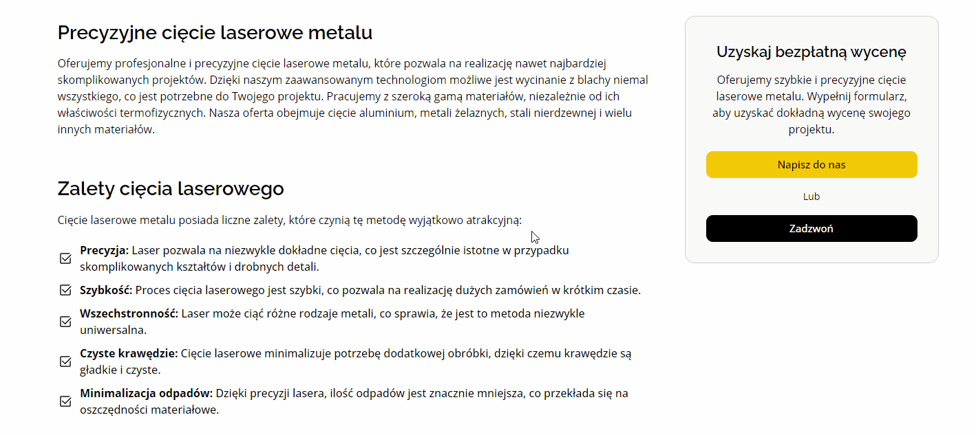 Na stronie Lunostyl znajdują się zakładki ofertowe, które w sposób przejrzysty i szczegółowy prezentują usługi firmy, takie jak obróbka metali, budowa hal przemysłowych i inne. Każda zakładka została zoptymalizowana pod kątem SEO, co zwiększa widoczność oferty w wyszukiwarkach i ułatwia potencjalnym klientom znalezienie potrzebnych informacji.