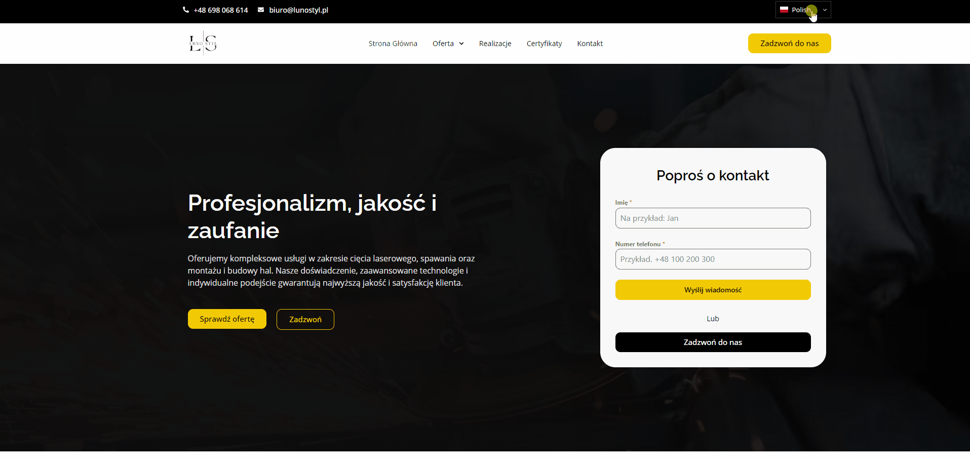 Lunostyl to firma specjalizująca się w obróbce metali oraz budowie hal przemysłowych i magazynowych. Naszym celem było stworzenie nowoczesnej, intuicyjnej strony internetowej, która skutecznie przedstawi ofertę firmy oraz ułatwi kontakt z potencjalnymi klientami. Projekt zakładał wdrożenie kilku kluczowych funkcji oraz stworzenie czytelnego i estetycznego layoutu, który odpowiadałby potrzebom i wymaganiom klienta.